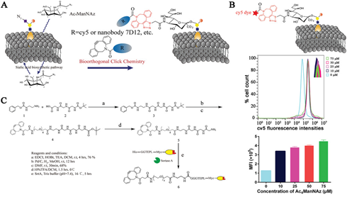 吴志猛教授团队和黄朝晖团队针对上述挑战,运用糖代谢工程、化学生物学以及发酵工程等技术,将具有更好肿瘤靶向性和组织穿透力的纳米抗体修饰到NK细胞表面,构建了纳米抗体7D12工程化的NK细胞并用于实体瘤的过继免疫治疗研究。体外研究表明:7D12-NK92MI对高表达EGFR的多种肿瘤细胞具有较强的识别能力和杀伤活性;在小鼠移植瘤模型中,7D12-NK92MI表现出良好的肿瘤组织穿透能力和抗肿瘤疗效。该技术具有良好的普适性,未来可以延伸到其他免疫细胞的修饰,如T细胞、巨噬细胞等;另外,基于该技术,只需更换不同靶向基团,就可获得针对特定肿瘤的工程化NK细胞,为实体瘤的过继细胞免疫治疗带来了新的希望。