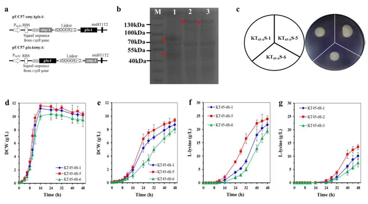 徐建中副教授团队采用“传统育种”和“基因工程育种”相结合的方法,对谷氨酸棒杆菌进行系统性改造,发现使该菌能够以淀粉为主要原料高效生产L-赖氨酸的两个关键因素:一是使该菌能够在高温下正常生长从而为高活性淀粉水解酶提供环境;二是将最适外源淀粉水解酶在谷氨酸棒杆菌中成功表达从而使该菌具有降解淀粉的能力。该研究通过适应性实验室进化、异源表达淀粉水解酶、重组双功能酶的融合表达和发酵验证等实验,成功实现将菌株耐高温的性能和高效降解淀粉的能力结合到一株产L-赖氨酸的谷氨酸棒杆菌中,使其能够以淀粉为主要原料高效地生产L-赖氨酸。这是首次报道的以淀粉为主要原料一步法高效合成L-赖氨酸的工程化产生菌,为实现以淀粉为主要原料工业化生产氨基酸提供理论基础和技术支持。
