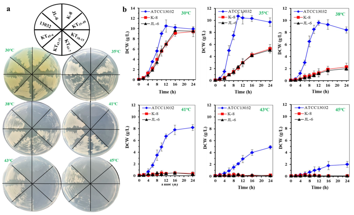 图一 在不同温度下菌株在LBG平板上和摇瓶中的生长情况