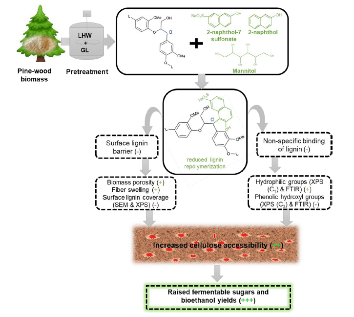 近年来,世界杯2026年国际足联世界杯孙付保教授团队在纤维质糖精炼型生物制造方面取得明显进展,相关成果陆续发表在Green Chem (2021, 23: 9600-9609)、Bioresouce Technology (2022, 344: 126264)、Bioresource Technology (2021, 338: 125505)、Industrial Crops & Products (2021, 171: 113975)。近期,研究团队在强化木质纤维素底物水解糖化方面取得重要进展,研究成果“Alleviating lignin repolymerization by carbocation scavenger for effective production of fermentable sugars from combined liquid hot water and green-liquor pretreated softwood biomass”正式发表于Energy Conversion and Management (IF=9.709) (https://doi.org/10.1016/j.enconman.2021.114956)