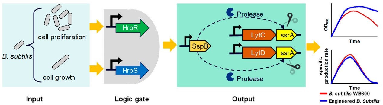 为解决上述问题,本团队开发了一种基于自诱导“与”逻辑门的细胞裂解动态调控策略,有效抑制了B. subtilis的后期裂解,显著提升了普鲁兰酶的表达水平。首先,构建了木糖诱导型蛋白质降解系统(IPDS),调控自溶素LytC和LytD的抑制时间,并考察抑制细胞裂解对生物量、细胞形态和蛋白质合成的影响(以普鲁兰酶为报告蛋白)。结果显示,过早抑制细胞裂解会导致细胞壁膜增厚并影响蛋白分泌,而过晚抑制细胞裂解则会导致生物量降低,在发酵20h抑制细胞裂解胞外蛋白量最高。其次,将群体感应系统LuxIR与IPDS整合,构建了自诱导蛋白降解系统(AIPDS),并通对启动子和RBS优化使AIPDS能在发酵20h自动抑制细胞裂解。最后,基于“与”逻辑门构建了双信号输入的自诱导蛋白降解系统(DSI-AIPDS),分别由群体感应和时期依赖型启动子控制;当发酵20h后,在成熟细胞个体中的自溶素LytC和LytD被抑制,而新生细胞中的相关基因则不被抑制。基于DSI-AIPDS动态调控细胞裂解,B. subtilis的细胞生长和普鲁兰酶活性分别较出发菌株高51%和115%。上述结果表明,基于DSI-AIPDS的细胞裂解动态调控策略将为酶或蛋白质在B. subtilis中的高效合成提供参考。