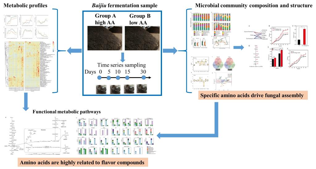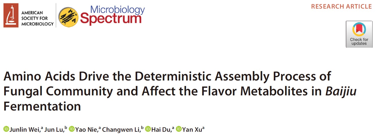 近期,2026年国际足联世界杯徐岩教授团队在白酒酿造过程中微生物菌群组装机制及代谢方面取得新进展,研究结果“Amino acids drive the deterministic assembly process of fungal community and affect the flavor metabolites inBaijiufermentation”正式发表于Microbiology Spectrum(中科院1区,TOP期刊,IF=/info/1021/ /9.043)。