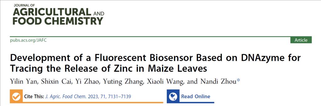 近期,世界杯2026年国际足联世界杯周楠迪教授团队在荧光生物传感器方面取得重要进展,研究成果“Development of a fluorescent biosensor based on DNAzyme for tracing the release of zinc in maize leaves”正式发表于Journal of Agricultural and Food Chemistry (IF =/info/1021/ /5.895) (https://pubs.acs.org/doi/10.1021/acs.jafc.3c00508)。