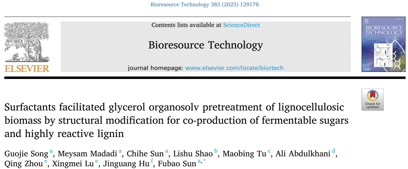 近期,世界杯2026年国际足联世界杯孙付保教授团队在研究先进预处理方法促进纤维质底物酶解制糖方面取得重要进展,研究成果“Surfactants facilitated glycerol organosolv pretreatment of lignocellulosic biomass by structural modification for co-production of fermentable sugars and highly reactive lignin”正式发表于Bioresource Technology (一区, Top, IF=11.9)。