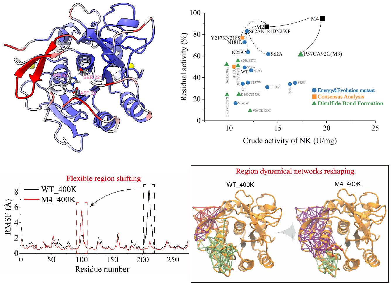 “活性-热稳定性Trade-off”现象长期以来是改造获取高性能酶的限制因素,尽管对该现象的研究由来已久,但是其背后的分子机制,尤其是蛋白质结构动力学变化所起到的作用始终没有得到良好解决。纳豆激酶是一种丝氨酸蛋白酶,其由于高效的纤维蛋白降解特性受到关注并在保健品领域广泛应用。但是,野生型纳豆激酶稳定性较差,严重影响产品稳定性,而传统单一策略提升稳定性的同时往往会带来酶活性降低。