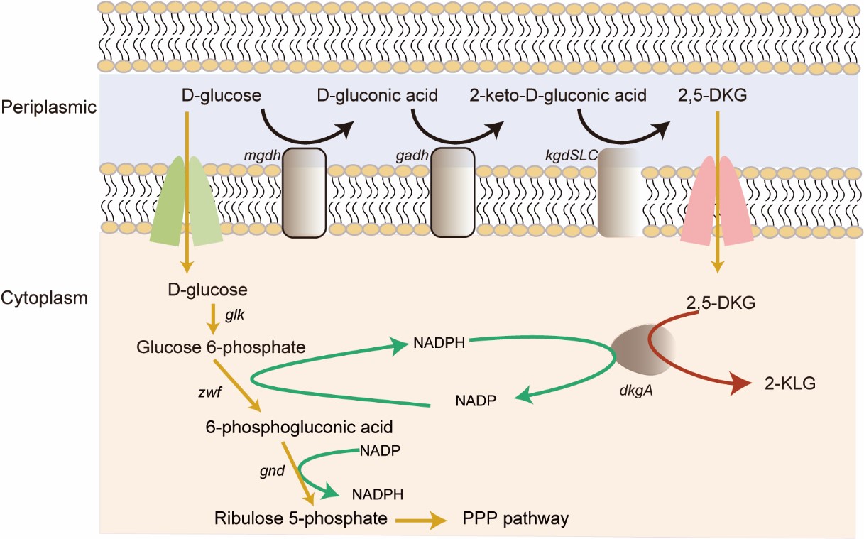 维生素C是人体必需的维生素之一,也是目前市场销售额最大的维生素。目前所有商业生产维生素C都是通过将2-酮基-L-古龙酸(2-KLG)进行酯化反应之后实现。当前,2-KLG主要生产方式是经典三菌两步法,首先通过高压加氢的方式将葡萄糖转化为山梨醇,然后使用氧化葡萄糖酸杆菌(Gluconobacter oxydans)将山梨醇转化为山梨糖,再通过由普通生酮基古龙酸菌(Ketogulonigenium vulgare)和巨大芽孢杆菌(Bacillus megaterium)组成的混菌发酵体系将山梨糖转化为2-KLG。但随着维生素C的市场需求量逐渐增加,进行产业升级,以更高效和经济的单菌一步发酵模式代替现有生产工艺也显得越发紧迫。直接以葡萄糖为底物通过2,5-DKG途径实现一步发酵合成2-KLG是最有经济价值的替代途径。几十年来,世界范围内的维生素C工业生产领域都在尝试应用更经济的单菌一步发酵路线取代三菌两步发酵过程,但始终没有较大进展。