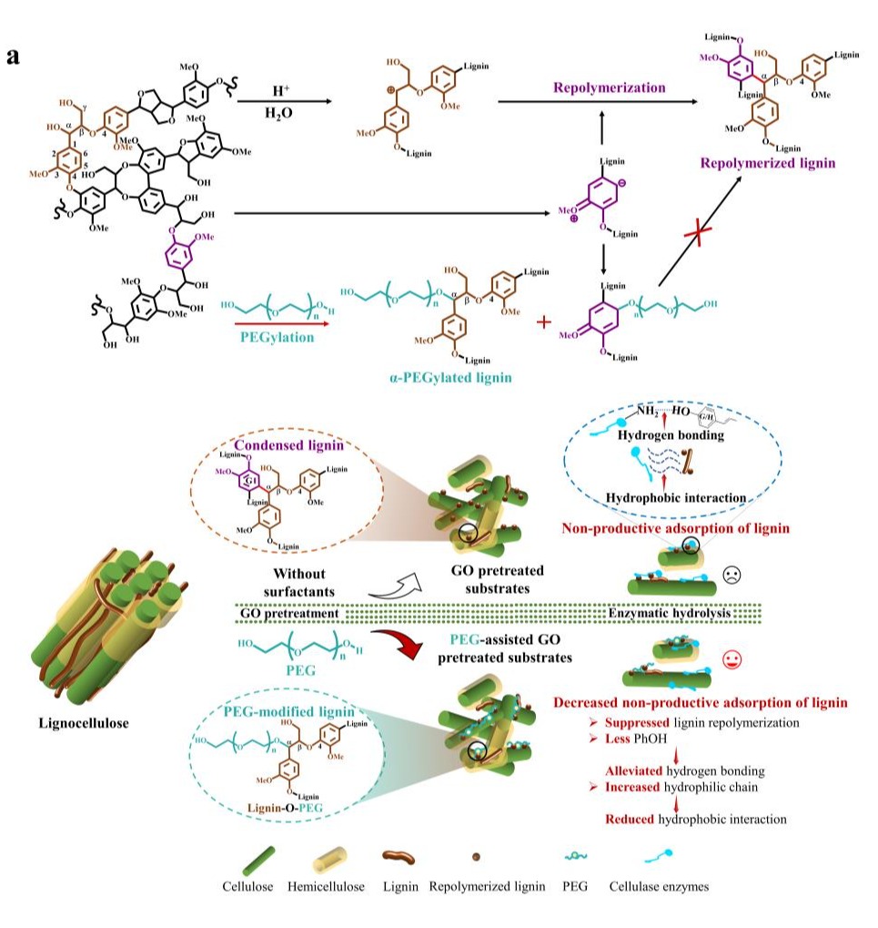 针对以上问题,孙付保教授团队研究发现在有机溶剂预处理过程中添加表面活性剂能原位修饰木质素,从而减缓木质素再缩合副反应,进一步提高预处理后底物的可酶解性。实验进一步通过现代分析技术手段解析了表面活性剂辅助预处理促进底物可酶解性的机理:表面活性剂通过醚化反应修饰了固体底物中残留木质素结构,使其含有更多β-O-4连接键和较少酚羟基(PhOH);这种修饰也使表面活性剂的亲水基团接枝到木质素结构上从而减少了残余木质素的疏水性,使底物后续酶解时残留木质素与纤维素酶之间的非生产性吸附减弱,最终提高了底物高效酶解产糖水平。此外,研究者们还通过MD和DFT等模拟分析初步阐明表面活性剂与木质素之间的相互作用以及抑制木质素再缩合的机制。