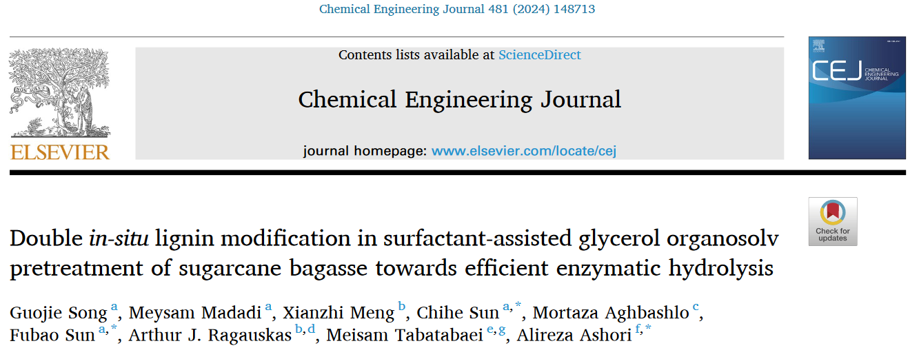 近期,世界杯2026年国际足联世界杯孙付保教授团队在研究先进预处理方法促进纤维质底物酶解制糖方面取得重要进展,研究成果“Double in-situ lignin modification in surfactant-assisted glycerol organosolv pretreatment of sugarcane bagasse towards efficient enzymatic hydrolysis”正式发表于Chemical Engineering Journal, 2024, 481:148713 (一区, Top, IF 15.1)