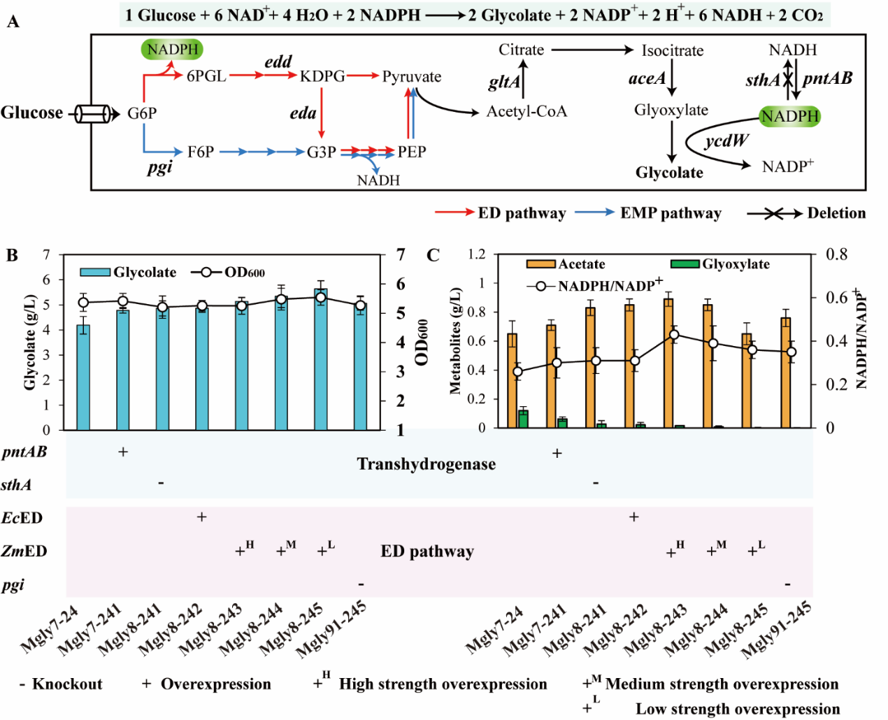此时,乙醇酸的生产中还面临着还原性辅因子NADPH缺乏的问题,为了增加胞内NADPH的生产,并阻止NADPH转化为NADH,研究人员在Mgly7-24中过表达了转氢酶pntAB,并敲除了转氢酶sthA,结果菌株Mgly8-241中的NADPH/NADP+比值和乙醇酸产量均出现增加,其中乙醇酸产量增加到4.9 g/L。为了进一步增加胞内NADPH,研究人员在菌株Mgly8-241中引入了来源于运动单胞菌中的ED途径,通过优化ED途径的表达,菌株Mgly8-245的乙醇酸产量增加至5.6 g/L,表明适度增加还原性辅因子NADPH的量,适配胞内辅因子NADPH的生成与乙醇酸的合成,可以有效增加乙醇酸产量。