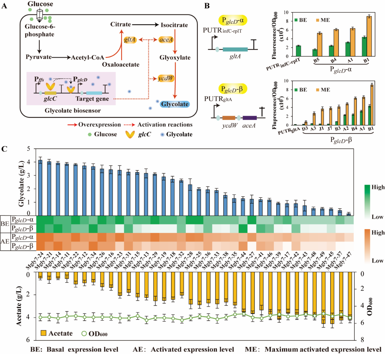 为了克服上述挑战,作者将动态策略应用于乙醇酸的生产中,首先,根据结合能强弱修改了乙醇酸传感器启动子的-10区和-35区,得到了一批具有不同基本表达水平和最大激活表达水平的乙醇酸传感器启动子 (PglcD-xy),然后选择一批基本表达水平与PUTRinfC-rplT和PUTRgltA相似或更高的PglcD-xy启动子,结合组成型表达的转录因子glcC,构建了可以根据乙醇酸浓度动态调节gltA和ycdW-aceA表达的动态调控系统,该系统可以利用乙醇酸传感器启动子的基本表达水平生产乙醇酸,生产的乙醇酸可以作为诱导剂增加乙醇酸传感器启动子的转录水平,从而进一步提高乙醇酸产量,通过优化后发现PglcD-B1调控gltA和ycdW-aceA表达时,菌株乙醇酸产量最高,达到了4.1 g/L (理论产量的61.3%)。同时,通过研究乙醇酸传感器启动子的基本表达水平和激活表达水平与乙醇酸产量的关系,发现,菌株的乙醇酸产量与gltA的表达水平呈正相关关系,R2为0.8。