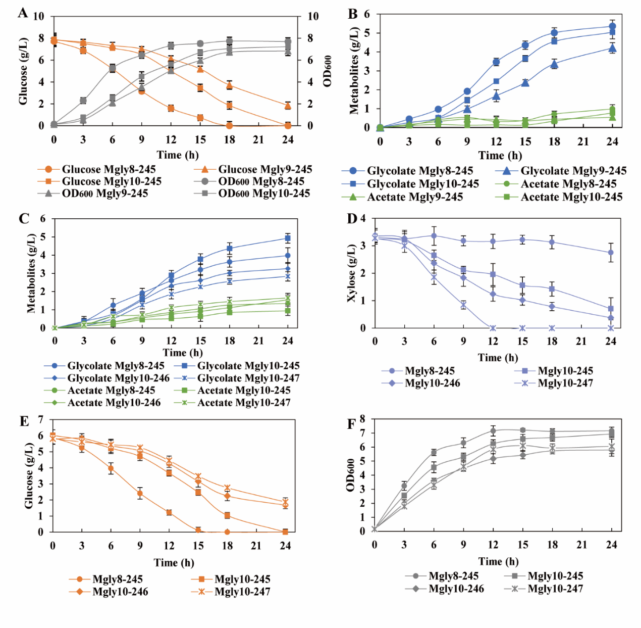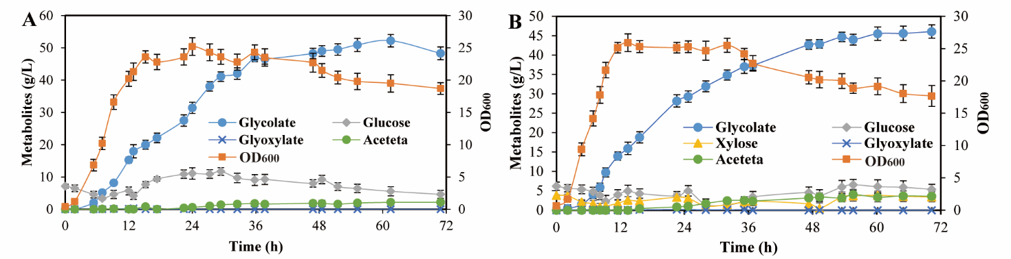 为了降低成本、可再生的玉米秸秆水解液作为乙醇酸生产的底物,研究人员在菌株Mgly8-245中敲除了ptsG来破坏CCR。然而,ptsG的敲除破坏了PTS系统,导致葡萄糖利用速率和乙醇酸产率降低。通过将源自运动单胞菌中的葡萄糖转运蛋白 (glf) 引入菌株Mgly9-245,成功的提高了葡萄糖消耗能力和乙醇酸产率。随后,将水解液稀释用于乙醇酸的生产,结果表明,缓解CCR的菌株Mgly10-245能够同时利用玉米秸秆水解液中的葡萄糖和木糖,最终乙醇酸产量达到4.9 g/L。
