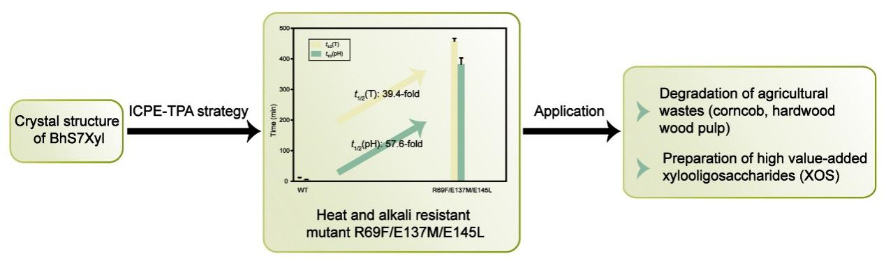 针对上述问题,夏小乐团队开发了一种基于等温压缩系数(βT)微扰工程(ICPE-TPA)策略,结合高压分子动力学模拟,理性筛选“热波动”区域,利用算法互补的自由能计算软件(FoldX、I-mutant2.0和Rosetta Cartesian_ddG)筛选潜在的突变体,随后进行突变体组合工程,从而得到高耐热耐碱性能的木聚糖酶。最佳突变体R69F/E137M/E145L比酶活达到了1368.6 U/mg,是WT的4.9倍;在耐热性方面,R69F/E137M/E145L在70℃环境下的温度半衰期达到了458.1 min,是WT的39.4倍;在耐碱性方面,同时在70℃和pH 9.0环境下的pH半衰期达到了383.1 min,是WT的57.6倍。利用分子对接分析和MD模拟分析,以探讨阳性突变体耐热耐碱性得到显著提升的原因。此外,将最佳突变体初步应用于制备低聚木糖当中,为酶法制备低聚木糖奠定了基础。