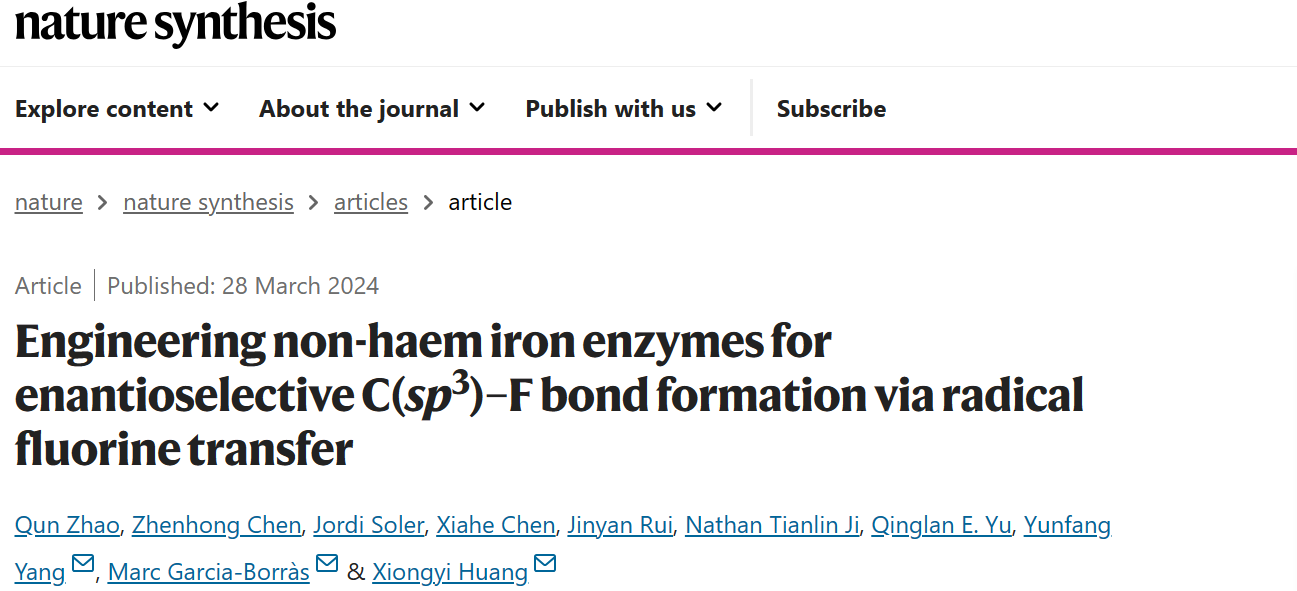 近期,世界杯2026年国际足联世界杯赵群教授和浙江工业大学杨云芳教授、赫罗纳大学Marc Garcia-Borràs教授、约翰霍普金斯大学Xiongyi Huang教授在金属酶催化新功能拓展方面取得重要进展,研究成果“Engineering non-haem iron enzymes for enantioselective C(sp3)–F bond formation via radical fluorine transfer”正式发表于《Nature Synthesis》杂志。