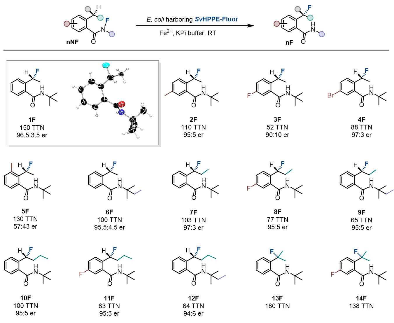 首先,作者以N-氟酰胺底物1NF作为模型底物,在全细胞条件下测试了40多种不同的非血红素铁酶,其中包括了前期开发叠氮化反应所积累SavHppD突变体库。通过测试发现了几种能够催化不对称氟转移反应的酶,最好的结果来自绿色链霉菌(Streptomyces viridochromogenes)的(S)-2-羟基丙磷酸酯环氧化酶(SvHppE),它以总转化数TTN =/info/1021/ /5、产率3.8%以及e.r =/info/1021/ /74:26的对映体比例生成了目标氟化产物。在不含SvHppE的空白对照实验中,仅能观察到痕量的氟化产物。此外,与催化中心铁配位的两个组氨酸被突变为丙氨酸,反应的产率和对映选择性显著降低,上述结果表明该转化过程是由金属铁中心催化完成。