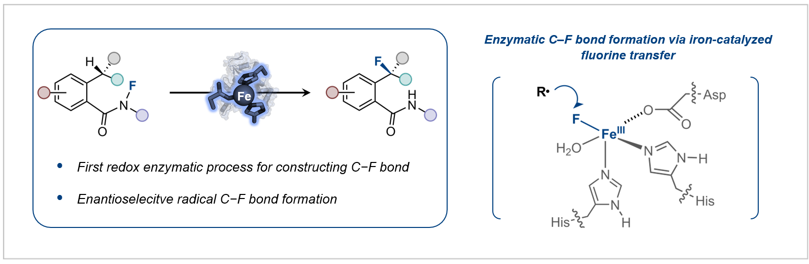 目前,通过酶促反应合成有机氟化合物的研究,主要集中在拓展氟化酶的底物范围以及将含氟砌块引入代谢途径这两大策略,尽管已经取得了一定进展,但是酶催化C–F键形成的发展仍显不足。如何建立新的生物催化机制来构建C–F键仍然是酶催化领域中颇具挑战性的科学难题。鉴于此,研究团队近日共同报道了基于新催化机制的酶促不对称氟化反应,首次将自由基氟原子转移机制引入到单一金属酶催化体系,实现了高立体选择性的氟转移过程(图2)。