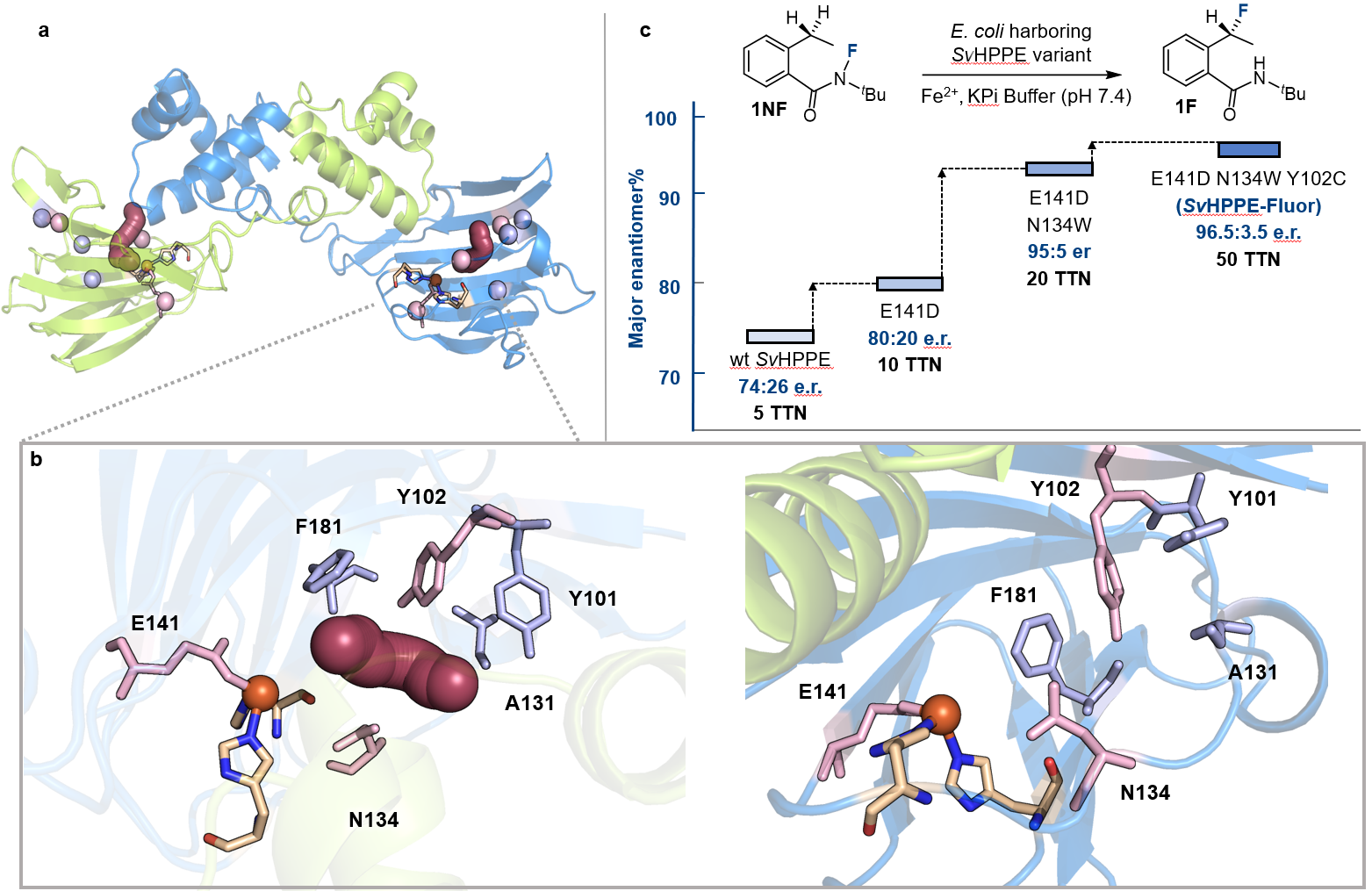 在确认了初始活性后,作者通过定向进化逐步提高了SvHppE的催化性能。鉴于天然底物S-HPP与模型底物N-氟酰胺1NF之间存在较大的结构差异,作者首先构建了SvHppE的同源模型,并对“酶–底物”进行了分子动力学(MD)模拟。再结合隧道分析,作者确定了一些关键的氨基酸残基位点,包括Y101、Y102、A131、N134和F181,这些残基很可能会影响底物1NF在SvHppE中的结合和定位。与中心铁配位的临近氨基酸残基E141同上述五个氨基酸位点,一并作为点饱和突变(SSM)的对象。对E141进行点饱和突变和筛选后发现了E141D优势突变体,其催化活性比野生型明显上升:产率7.1%和对映体比例e.r =/info/1021/ /80:20。以E141D突变体作为母体,在其他五个位点上进行了后续点饱和突变和筛选,得到了一个三重突变体SvHppE_N134W_E141D_Y102C(以下简称:SvHppE-Fluor),能够以TTN =/info/1021/ /50、产率30%和对映比96.5:3.5的催化效率得到目标氟化产物(图3)。