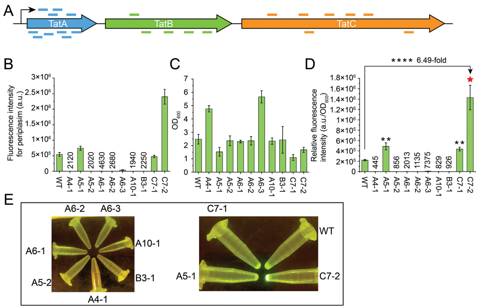 利用新一代BE编辑窗口的优势,设计构建了靶向E. coli Tat分泌系统的sgRNA文库用于开发高分泌性能的E. coli底盘。经过基因组编辑以及荧光筛选实验分析,获得了一株蛋白分泌性能提升6.49倍的E. coli底盘,证明了该CBE系统在微生物底盘宿主进化中的应用潜力。测序结果显示,在E. coli宿主中新一代BE的编辑窗口是目前已报道BE的8~10倍,是迄今微生物系统中编辑窗口最宽的BE。