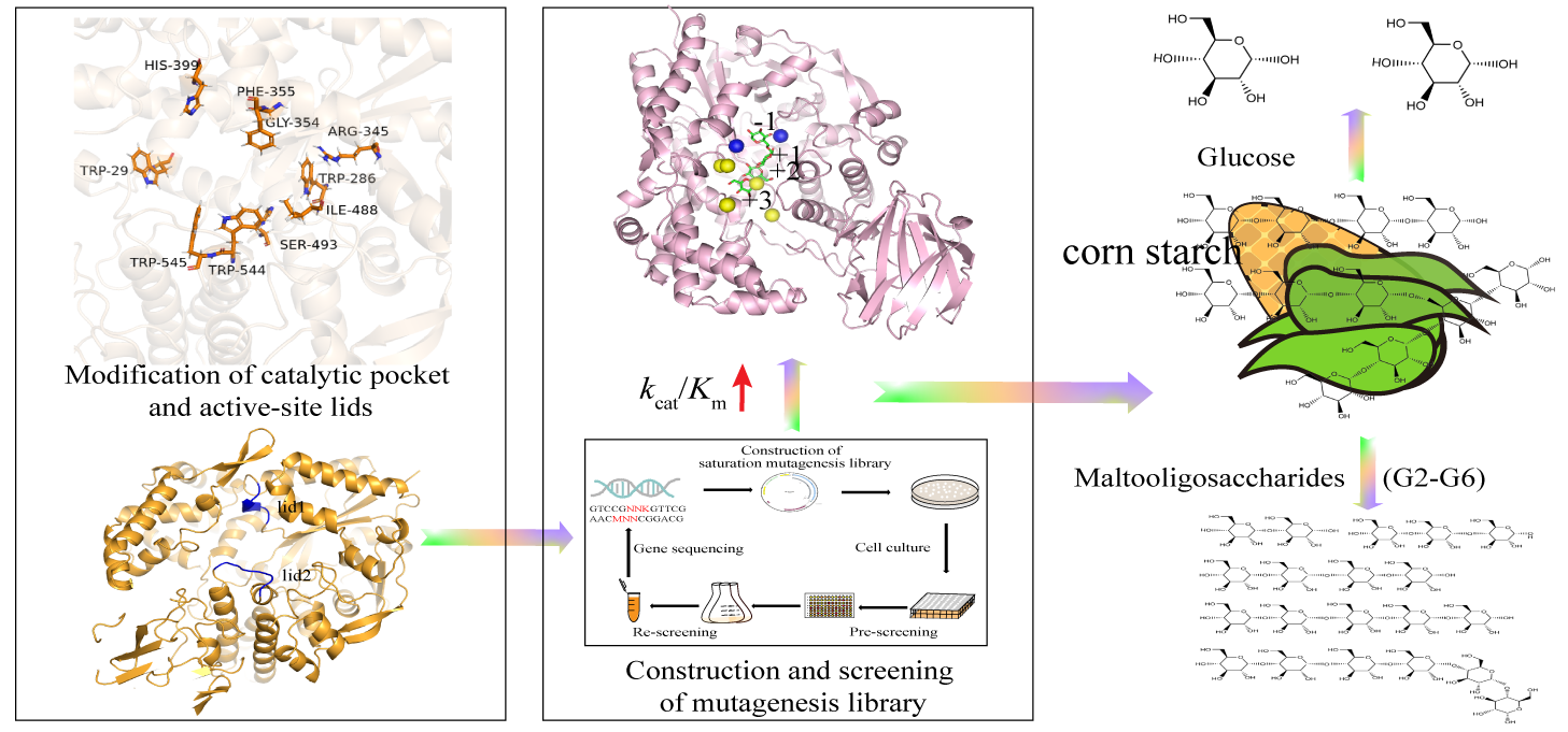 周哲敏教授团队针对麦芽低聚糖及葡萄糖制备中的问题,对超嗜热普鲁兰酶PulPY2不同区域的合理突变,并将优势突变体与淀粉水解酶协同作用,用于高效制备麦芽低聚糖及葡萄糖。通过对PulPY2的底物结合口袋及活性位点上方盖子关键氨基酸的定向进化,结合构建的高通量筛选方法,获得了催化效率提高5倍的优势突变体。将优势突变体与α-淀粉酶协同作用于玉米淀粉,一锅法生产麦芽低聚糖,其转化率高达96.1%,比原始酶PulPY2提高了5.4%,比单酶法(α-淀粉酶)提高了12.6%。该方法操作简单,并可以充分利用淀粉资源。将优势突变体与α-淀粉酶协同用于淀粉液化过程及使用糖化酶用于糖化过程以制备葡萄糖。优势突变体反应体系的整体糖化时间分别比原始酶反应体系及传统方法反应体系缩短了8 h及16 h,表明突变体与α-淀粉酶协同用于淀粉液化过程有利于加速淀粉制糖工业的进程。本研究所获得的普鲁兰酶优势突变体以及建立的麦芽低聚糖和葡萄糖制备的新工艺在淀粉糖工业中具有广泛的应用前景。