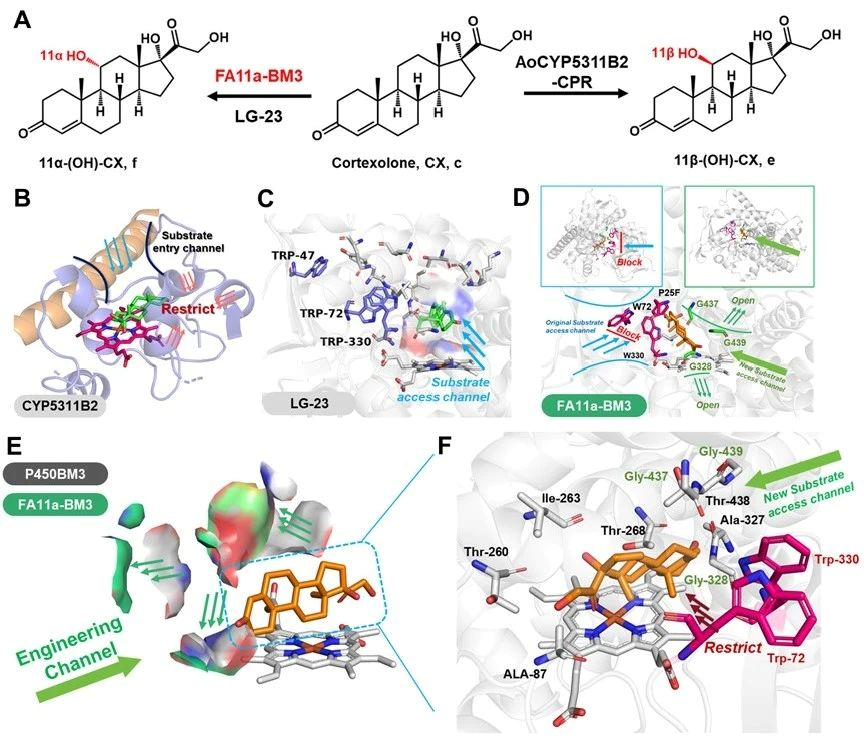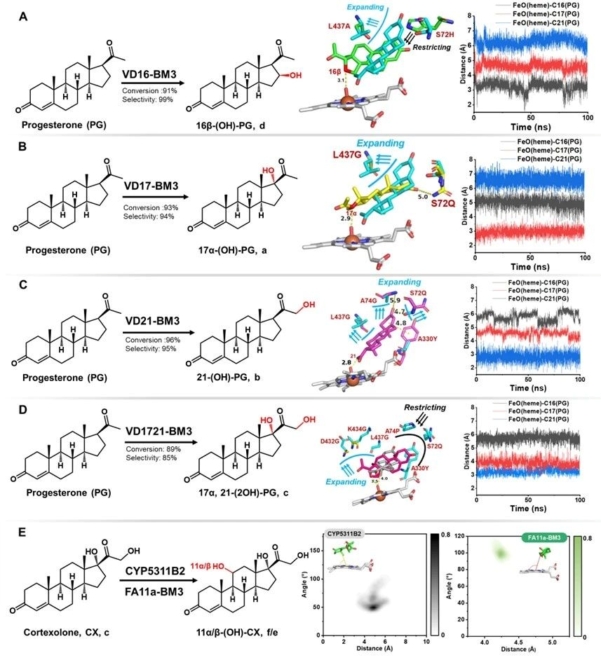 针对上述问题,江南大学食品合成生物学与生物制造团队研究人员基于计算模拟指导改造了P450BM3并用于黄体酮合成皮质酮再合成氢化可的松的两步合成途径中。第一步合成:以野生型P450BM3(Bacillus megaterium来源)出发,逐步通过B-Factor指导的底物通道改造、重塑heme中心口袋和自由能计算指导的heme中心口袋柔性化的三代精细化酶工程,最终获得了VD16-BM3、VD17-BM3、VD21-BM3和VD1721-BM3可以分别高效区域选择性羟化黄体酮的C16β、C17α、C21和C17α/21,值得注意的是VD1721-BM3可以将黄体酮合成皮质酮的步骤简化为一步单酶反应。第二步合成:需要获得高效催化元件羟基化修饰皮质酮的C-11位,首先分别验证了文献报道的CYP5311B2和LG23,其中CYP5311B2可以羟化修饰皮质酮的C-11β,其转化率和区域选择性分别为93%和91%,可以用于后续氢化可的松全细胞合成体系构建。CYP5311B2和LG23催化进程研究发现底物通道是影响P450羟化修饰甾体不同碳位的关键,因此基于底物通道切换策略,理性改造得到了FA11a-BM3可高效催化皮质酮合成11α-氢化可的松,转化率和区域选择性分别为85%和90%。分子动力学模拟揭示了heme中心口袋排斥底物残基的柔性化有助于目标羟化碳位稳定暴露于FE=O上方。最终,将开发的P450突变体用于构建高效的大肠杆菌全细胞催化体系,实现了从1 g/L黄体酮一锅生产11α/β-氢化可的松,摩尔转化率为81%和84%。本研究为简化甾体药物的生物合成步骤和生物催化剂提供了可行的策略。