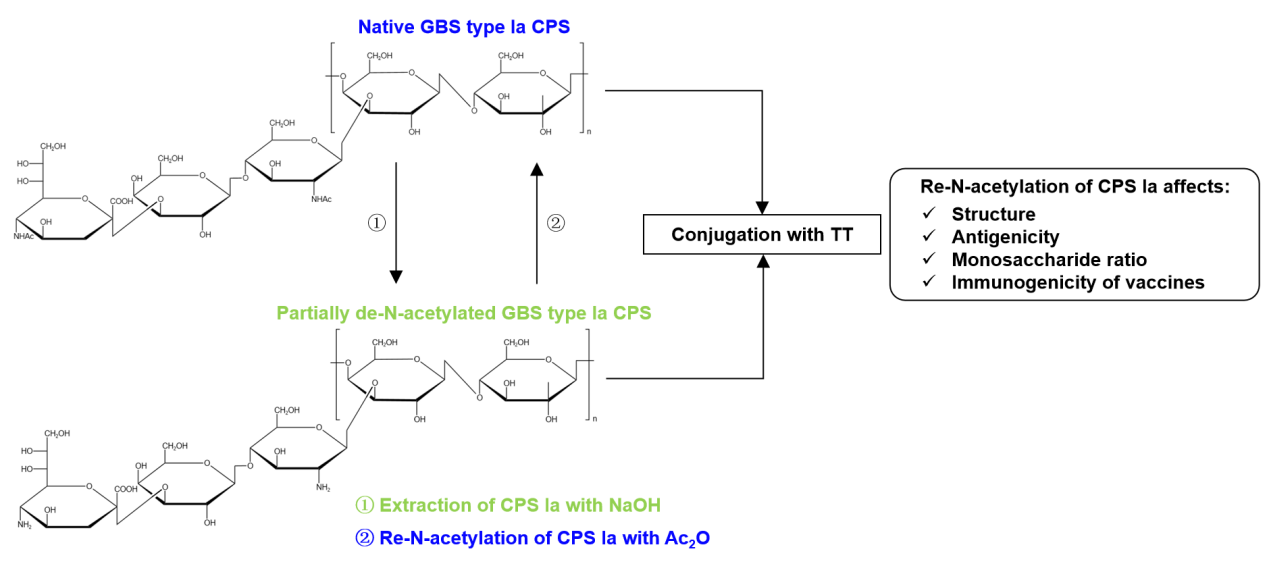 B族链球菌(GBS)是一种革兰氏阳性菌,常以无症状的形式定植于成年女性尤其是围产期妇女体内,是引起新生儿败血症和脑膜炎的主要病原体之一。目前市面上没有针对GBS感染的疫苗,荚膜多糖被认为是最具潜力的疫苗候选抗原之一。GBS荚膜多糖是一类侧链含唾液酸(Neu5Ac)的大分子多糖。碱法提取GBS多糖是一种高效、低成本的方式,不过该方法会不可避免地破坏多糖侧链末端Neu5Ac上的O-乙酰基和N-乙酰基。尽管已有研究表明O-乙酰基对GBS多糖结合疫苗的免疫原性无明显影响,对碱法提取的荚膜多糖进行再N-乙酰化修饰已是一种常态,但是尚未有研究报道再N-乙酰化对GBS荚膜多糖生物功能的影响。