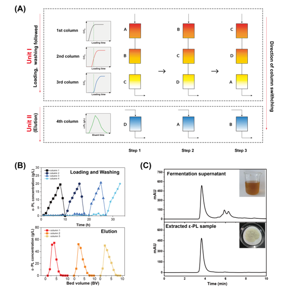 针对此问题,陈旭升教授课题组首先建立了强酸型阳离子树脂吸附提取ε-PL工艺,革除了传统依赖弱酸型阳离子树脂吸附提取ε-PL工艺,大幅降低了酸碱使用量和废水产生量。其次,为提高ε-PL进料浓度和树脂利用率,设计了四柱连续离子交换工艺,通过正交实验对操作方式和条件进行了系统优化,成功构建了连续性和稳定性均良好的的四柱序列连续离子交换分离纯化ε-PL工艺。与间歇式固定床相比,四柱序列连续离子交换工艺成功将ε-PL进料浓度从15 g·L-1提升到35 g·L-1,树脂吸附容量从133.36 mg·g-1提升到244.34 mg·g-1,树脂利用率从46.15%提升到84.69%,并节省了51.60%的水耗和58.86%的酸碱用量。最后,将新建立的连续离子交换技术整合到团队已有的ε-PL提取工艺中,实现ε-PL纯度96.57%、总收率73.10%。本研究首次将强酸型阳离子树脂应用于ε-PL分离提取领域,并建立了连续离子交换工艺,实现了ε-PL高效分离纯化和降碳减污,为大规模ε-PL绿色生物制造奠定了技术基础。