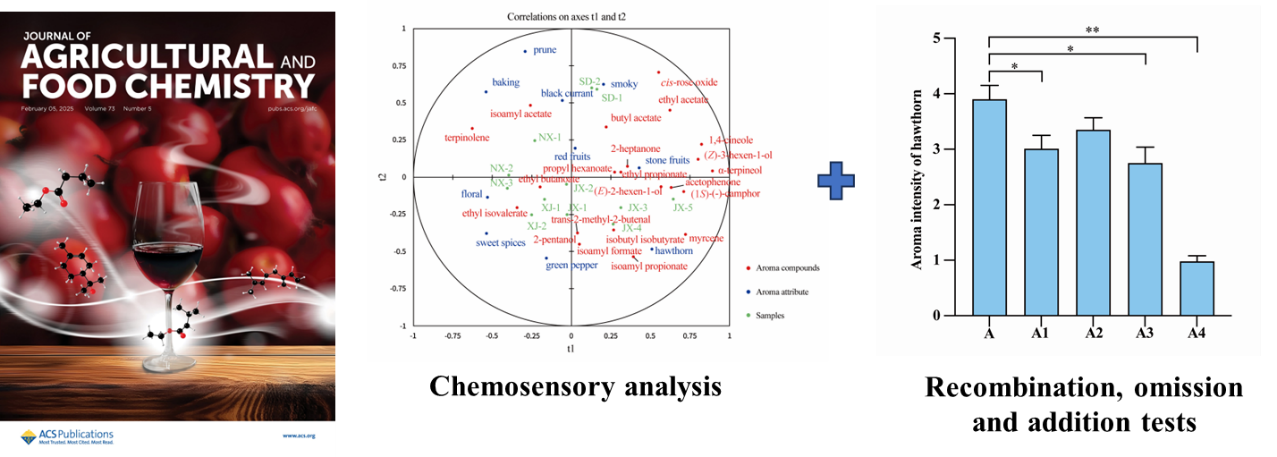 近日,世界杯生物工程学院徐岩教授团队唐柯副教授在葡萄酒山楂特征风味解析方面取得重要进展,相关研究成果“Characterization of odorants causing the hawthorn aroma in Cabernet Sauvignon wine by gas chromatography-olfactometry, quantitation, aroma recombination, omission and addition studies”以封面文章发表于Journal of Agricultural and Food Chemistry(一区, Top, IF 5.7)(https://pubs.acs.org/doi/10.1021/acs.jafc.4c09533)。