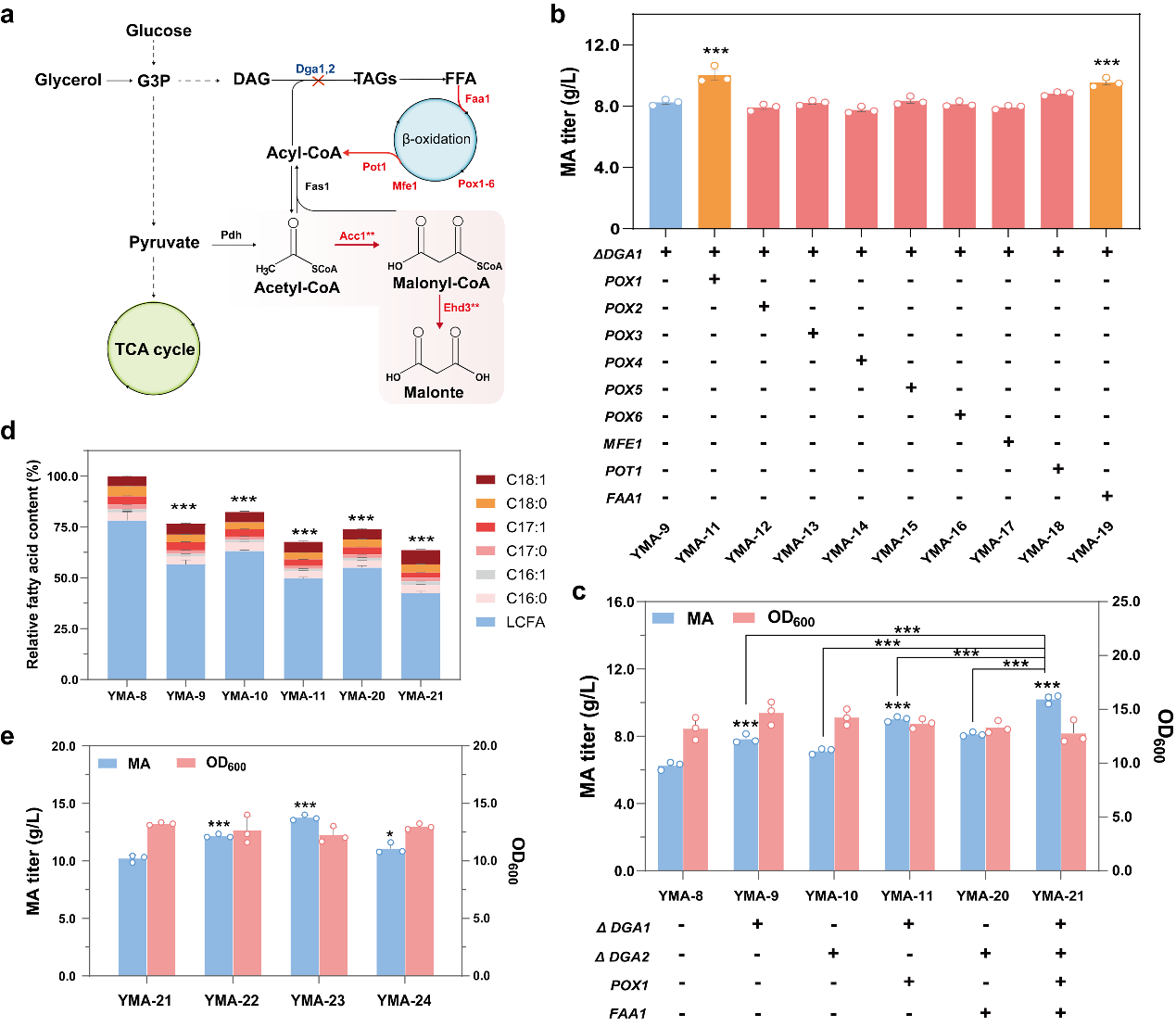 江南大学2026年国际足联世界杯邓禹教授课题组选取耐酸性能力强、丙二酸前体丙二酰辅酶A高代谢通量的解脂耶氏酵母为底盘细胞,通过筛选丙二酸生物合成过程中的关键酶丙二酰辅酶 A 水解酶设计构建了基于丙二酰辅酶A途径合成丙二酸的工程菌株。首先,通过在解脂耶氏酵母中构建 3 种不同的合成途径评估了丙二酸合成能力,验证了来自酿酒酵母的丙二酰辅酶A水解酶Ehd3**途径效率最高。为进一步提升 MA 的产量,从解脂耶氏酵母和尖孢镰刀菌中鉴定出两种具有高催化活性的新型丙二酰辅酶 A 水解酶,其中表达尖孢镰刀菌丙二酰辅酶 A 水解酶FoEhd3**可使丙二酸产量提高至 6.3 g/L。随后,通过对工程菌株进行代谢改造,确保前体乙酰辅酶 A 和丙二酰辅酶A有充足的通量用于丙二酸的生产,在摇瓶培养中丙二酸产量达到 13.8 g/L。最后,通过优化发酵条件并在 5L 发酵罐中进行高密度发酵,以甘油为初始碳源,在初始培养基中甘油耗尽后,采用恒速进料策略,发酵156 h 时,丙二酸的最高产量达到 63.6 g/L,产率为 0.41 g/L/h。本研究为工程化解脂耶氏酵母生产丙二酸提供了一种绿色、高效的合成方法,为丙二酸的工业化生产提供了可能。