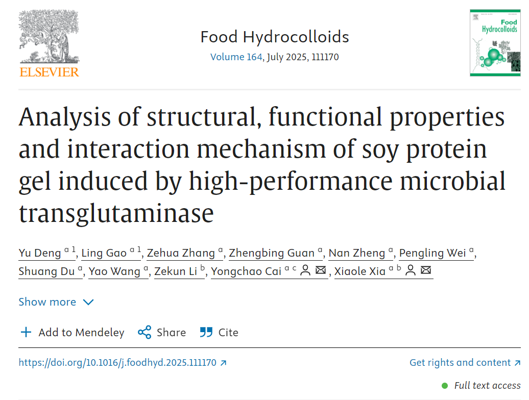 近期,世界杯2026年国际足联世界杯夏小乐教授团队在微生物来源谷氨酰胺转氨酶(MTG)的改造与应用研究中取得新进展,研究结果“Analysis of structural, functional properties and interaction mechanism of soy protein gel induced by high-performance microbial transglutaminase”正式发表于Food Hydrocolloids(一区TOP期刊,IF=11.0) (https://doi.org/10.1016/j.foodhyd.2025.111170)。