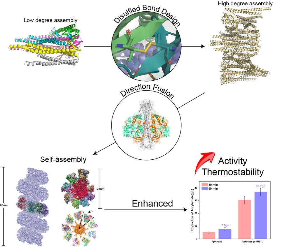 针对这一问题,研究者展示了一种由詹氏甲烷球菌通过二硫键工程化构建的稳健自组装支架,该支架能够在体外无需额外化学修饰或生物偶联的情况下,高效地将大体积酶组装成高阶螺旋结构。当直接与单体Endo-1,4-β-木聚糖酶A融合时,客酶的催化效率提高了2.5倍,同时热稳定性也得到了增强。此外,将该支架与多聚体金属酶腈水合酶整合,克服了此类工业酶常见的稳定性-活性权衡问题,使其活性提高了3倍,热稳定性提高了28倍。结构分析表明,人工构建的螺旋扭曲结构创造了新的界面相互作用,并为客酶的活性位点提供了集中分布。进一步将荧光蛋白对与支架融合,显示出12倍更高的FRET效率,表明其在双酶级联应用中的潜力。