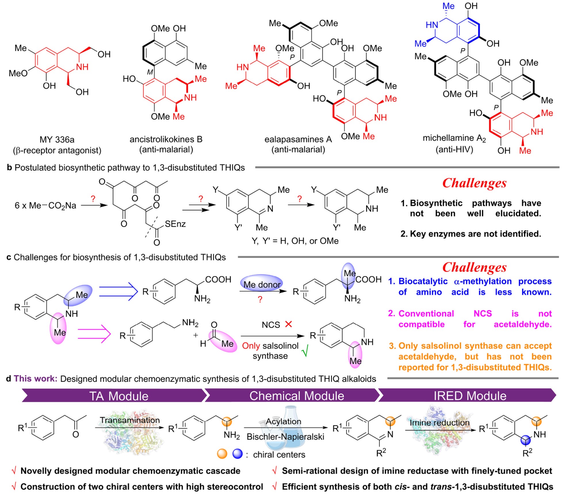 1,3-二取代四氢异喹啉(THIQs)广泛存在于天然生物碱中,具有多种生物活性,如β-肾上腺素受体拮抗、抗疟疾和抗HIV活性等。然而,由于该类化合物在THIQ的1,3-位含有特殊的二取代结构,其生物合成途径不明确,关键酶未知,无法通过传统的生物合成方法实现高效生产。为解决上述挑战,本研究设计了一条新的模块化化学酶级联反应途径,克服了生物途径未知的难题,并通过关键酶的半理性改造,实现了一系列1,3-二取代THIQs的高效与高立体选择性合成,并展示了其在制备顺式和反式1,3-二取代THIQs异构体中的潜在应用价值,为生物合成途径不明确的天然产物提供了有效的制备方法,体现了模块化化学酶级联反应在合成生物学领域的广阔前景。