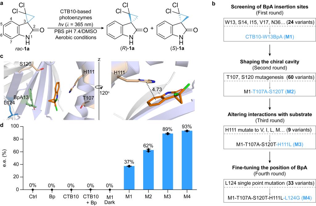 为了提高反应的对映选择性,基于M1的晶体结构进行分子对接分析,并构建突变文库,经过四轮迭代突变重塑手性空腔、改变底物在活性位点附近的构象并微调BpA位置得到最优突变体M4,在温和条件下实现93%的对映选择性(图3),超越了传统化学光催化剂的性能。
