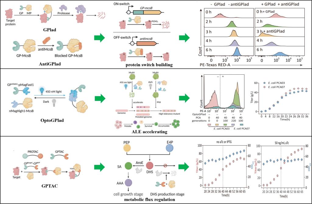 刘立明教授带领团队开发了一种靶向蛋白质降解技术——引导蛋白标记与降解系统(GPlad),该系统包含三个关键组成部分:标记蛋白(MP)、引导蛋白(GP)和蛋白酶。其工作原理如下:首先,从头设计的引导蛋白将标记蛋白定位到目标蛋白附近;然后,标记蛋白将标记引入目标蛋白;最后,标记的目标蛋白被特异性蛋白酶降解。该设计无需额外添加蛋白降解剂或预先融合蛋白降解子,即可实现目标蛋白的特异性降解。作为概念验证,GPlad系统成功降解了包括荧光蛋白、代谢酶和人源蛋白在内的多种类型的蛋白质。同时,该研究还以GPlad系统为基础,开发了antiGPlad、OptoGPlad和GPTAC等调控工具,进一步拓展验证了可逆抑制、光遗传学控制及最小嵌合体设计等功能,在蛋白回路构建、细胞功能调控以及代谢工程等领域展现出优秀的应用潜力。