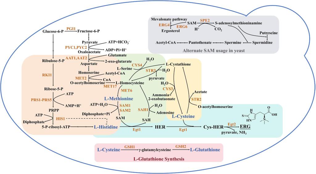 在底盘细胞构建方面,研究团队系统总结了以大肠杆菌、酵母、谷氨酸棒状杆菌等为宿主的代谢工程策略,包括关键酶表达优化、前体供应增强、竞争路径敲除、蛋白工程改造等手段,显著提升了麦角硫因的产量与合成效率。例如,通过在大肠杆菌中引入真菌来源的Egt1和Egt2基因,并结合前体代谢路径优化,已实现5.4 g/L的麦角硫因产量。