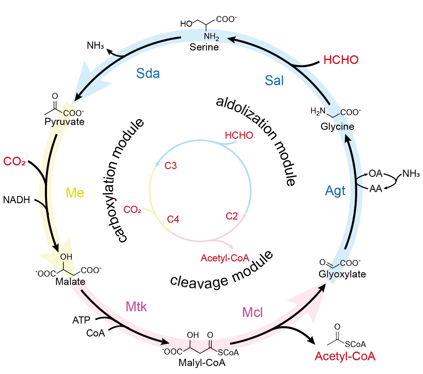 利用一碳化合物(C1)进行生物制造是实现可持续生物经济的重要策略之一。目前,为提升C1化合物的利用效率,研究者们采取了多种策略,包括:筛选高效的C1固定酶、设计新的C1固定途径以及构建高效的C1固定微生物细胞工厂。然而,上述研究主要集中于单一类型C1化合物的利用,如CO2/HCO3⁻、甲醇、甲醛或甲酸盐等,而对CO2与甲醛协同利用的研究较少。因此,基于C1化合物共利用的理念,重新设计或从头构建新型人工CO2与甲醛固定途径,有望为C1资源化利用提供新见解,进一步拓展其应用前景。