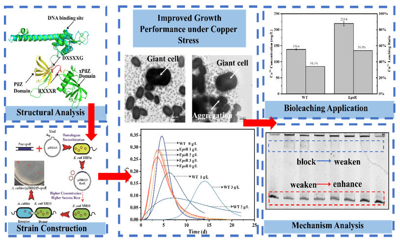 EpsR过表达菌株在生物资源化利用低品位矿物展现出良好性能,附着菌体数量提升了55.0%,最终生物浸出效率较野生型菌株大幅提高了36.8%。研究证实EpsR可通过强化附着、增强EPS介导的“接触”机制来提升浸出效率。分子机制研究表明,EpsR蛋白能够结合自身启动子,且该结合作用可被Cu²⁺解除,证实其直接感知铜离子信号。定点突变实验表明PilZ结构域中的关键氨基酸位点(S148)同时影响其与c-di-GMP的结合能力和DNA结合活性,揭示了EpsR作为连接Cu²⁺胁迫感知、c-di-GMP信号转导与生物膜形成调控的核心枢纽作用。该研究不仅为认识极端微生物的环境适应策略提供了新见解,也为通过合成生物学手段挖掘利用改造该类极端微生物提供了重要的理论依据和靶点。
