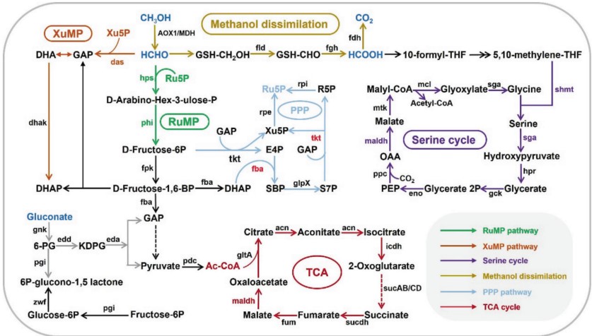 甲醇代谢分为氧化(产能)和同化(生物合成)途径。甲醇首先被氧化为甲醛,甲醛为代谢枢纽,其同化有四条核心途径:1)RuMP途径(细菌主导):甲醛与核酮糖-5-磷酸(Ru5P)缩合。2)XuMP途径(酵母特有):甲醛与木酮糖-5-磷酸(Xu5P)缩合。3)丝氨酸循环:甲醛经亚甲基-THF与甘氨酸缩合。4)还原甘氨酸途径(rGlyP):直接同化甲酸/CO₂,经甘氨酸裂解系统(GCS)生成丝氨酸并转化为丙酮酸。