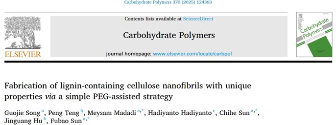 近期,世界杯生物资源与生物炼制研究团队在利用木质纤维素生物质转化为绿色纳米材料方面取得重要进展,研究成果“Fabrication of lignin-containing cellulose nanofibrils with unique properties via a simple PEG-assisted strategy”正式发表于《Carbohydrate Polymers》(一区,Top,影响因子:12.5)【2025, 370: 124363】。