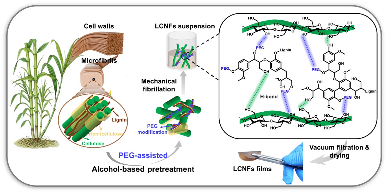 目前LCNFs制备方法多基于化学处理(传统酸、碱、有机溶剂等)与机械解纤组合等工艺。然而,在化学预处理中常发生木质素再缩合反应,导致其结构刚性和疏水性增加,这些变化会进一步削弱木质素与纤维素之间的界面相容性,阻碍体系氢键网络形成,也难以构建结构致密、性能强韧的薄膜材料。因此,在充分利用木质素优势的基础上,进一步调控其结构与性质,已成为提升LCNFs界面相容性及构建高性能LCNFs材料的重要研究方向。孙付保教授团队提出在醇基有机溶剂预处理过程中通过引入聚乙二醇(PEG)原位调控木质素结构的策略。结果表明,PEG能够有效捕获木质素反应性中间体,通过抑制C–C缩合反应而显著提高木质素中β-O-4连接键含量; PEG末端羟基也可与木质素羟基发生醚化反应,从而降低酚羟基含量并增加其化学稳定性。残余木质素经PEG原位修饰后亲水性与表面负电性等理化特性得到显著改善,在机械纳米化过程中有效抑制了木质素聚集,增强了木质素与纤维素间的界面结合强度,促进形成更稳定的三维网络结构,从而显著改善LCNFs悬浮液的流变性能,最终制备的LCNFs薄膜在力学性能上也表现突出,其拉伸强度和断裂伸长率均大幅提升。此外,制得的LCNFs具有更优的热稳定性与更浅的外观颜色。总之,论文中构建的原位PEG修饰策略实现了木质素结构的有效调控,成功制备出性能可调、三维网络结构致密的LCNFs,这为其它高性能纤维素基纳米材料的开发提供了新途径。