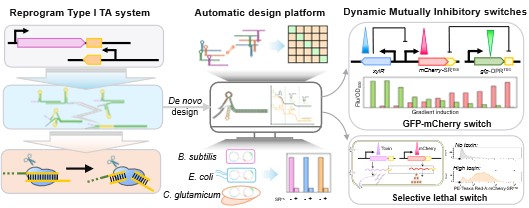 I型毒素-抗毒素(TA)系统是细菌基因组中广泛存在的转录后调控模块,其常见的工作机制是依靠小RNA抗毒素与毒素mRNA配对形成空间位阻干扰毒素蛋白的翻译,或形成RNA双链后被特定核酸酶识别并加速毒素mRNA降解。因其调控机制具有动态可逆、响应迅速和模块性强等特点,故可被改造成为一类转录后调控的人工RNA元件。但天然I型TA系统的功能发挥往往依赖特定宿主背景体系,导致现有的此类元件标准化程度低。同时已报道的I型TA系统数量有限且构效关系复杂进一步限制了其可设计的序列空间,导致元件之间工作容易发生非特异配对与串扰,难以支撑基因电路的复杂调控。