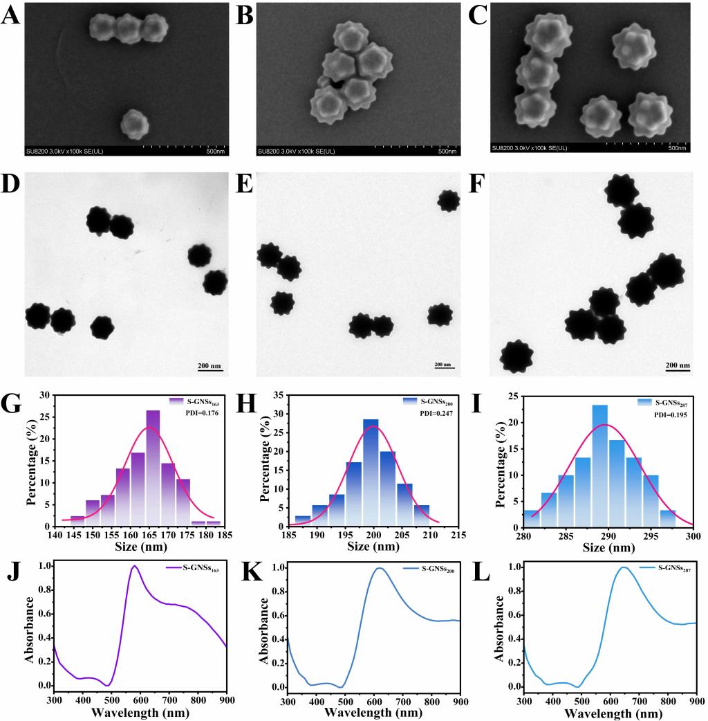 S-GNSs163、S-GNSs200和S-GNSs287的(A-C) FESEM图;(D-F) TEM图;(G-I) 粒径直方图;(J-L) 紫外可见光谱图