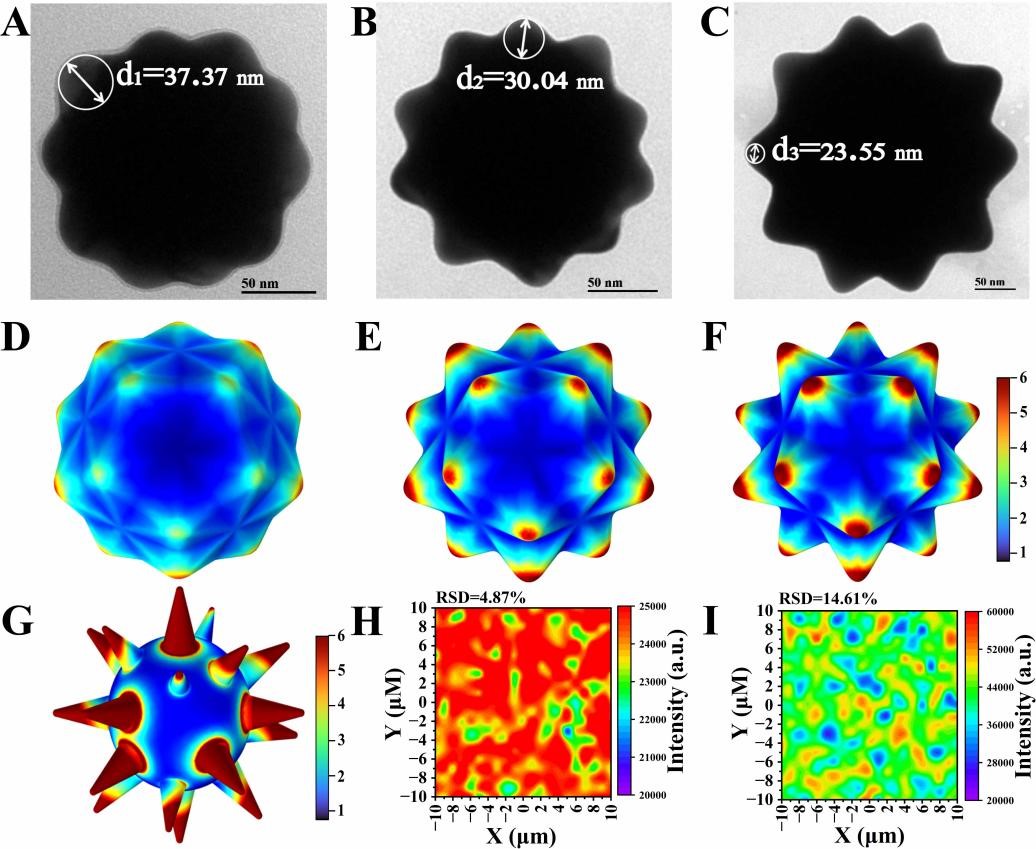 使用Digital Micrograph软件对(A)S-GNSs163、(B)S-GNSs200和(C)S-GNSs287的尖端弧长直径进行归一化处理后的尺寸标度;通过COMSOL软件模拟得到(D)S-GNSs163、(E)S-GNSs200、(F)S-GNSs287和(G)GNSs288基底的电磁场强度分布图;在10×10 μm2区域内441个点测量的(H)S-GNSs287@4-NT 和(I)GNSs288@4-NTP基底在1344 cm-1处的拉曼强度热图
