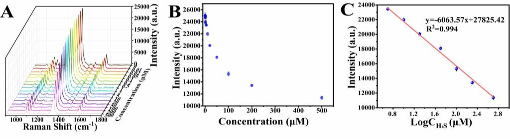 S-GNSs287@4-NTP与不同浓度Na2S(0.01-500 μM)反应后的(A)拉曼光谱和(B)1344 cm−1处的拉曼强度;(I)1344 cm−1处的拉曼强度与Na2S浓度的对数之间的线性关系。误差条为平均值±标准差(n =/info/1021/ /3)。