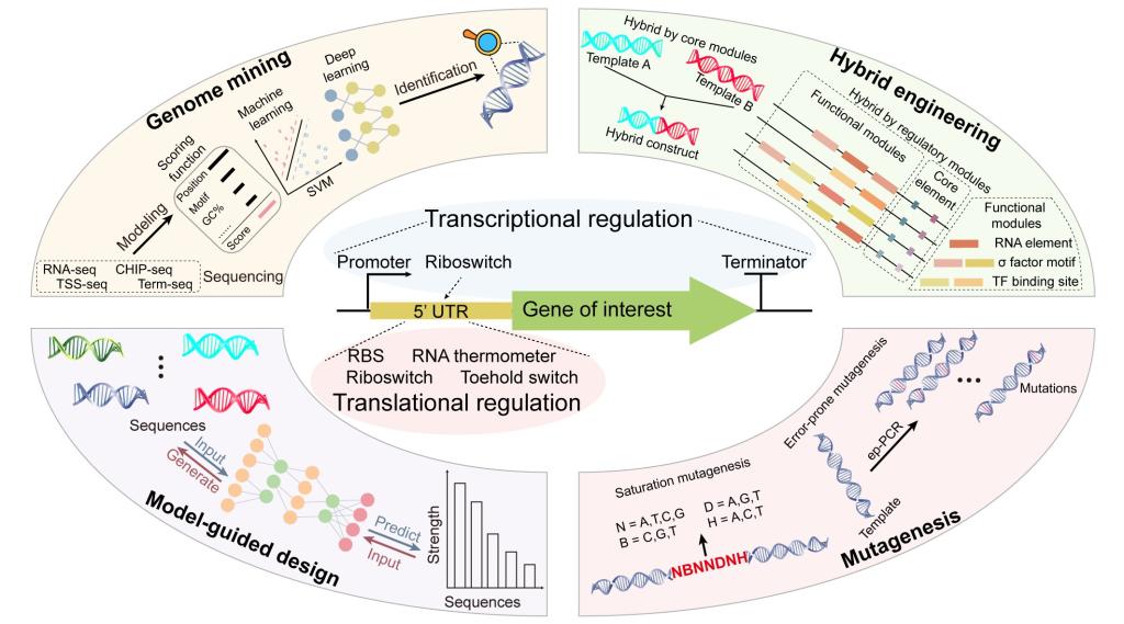 本综述围绕原核生物基因表达调控元件的设计方法体系,对近年来相关研究进展进行了系统梳理。文章以技术发展脉络为主线,总结并比较了原核基因表达调控元件设计的四类主要策略,包括基于基因组挖掘的天然调控元件发现、通过功能模块重组实现性能优化的杂合工程、依赖随机突变或定点突变并结合高通量筛选的突变文库策略,以及近年来迅速发展的模型与人工智能驱动设计。这些策略分别从天然序列资源利用、模块化结构重组、规模化实验筛选以及数据驱动预测与生成等层面拓展了基因表达调控元件的设计空间,并被广泛应用于启动子、终止子以及 5′UTR 等关键调控层级的工程改造与性能优化。文章进一步系统比较了不同策略在设计效率、可预测性、实验成本以及应用场景方面的特点与局限,并分析了这些策略在不同类型调控元件中的适用性与设计特点,指出传统实验筛选方法虽然能够有效扩展序列空间,但仍面临效率与成本方面的挑战。随着高通量测序技术的发展和大规模序列与功能数据的积累,机器学习与深度学习方法正在显著提升基因表达调控元件的预测与设计能力。综述认为,人工智能与实验工程策略的深度融合,将有望推动基因表达调控由经验驱动的优化模式向可预测、可编程的理性设计模式转变,为微生物细胞工厂构建和合成生物系统设计提供新的技术路径。