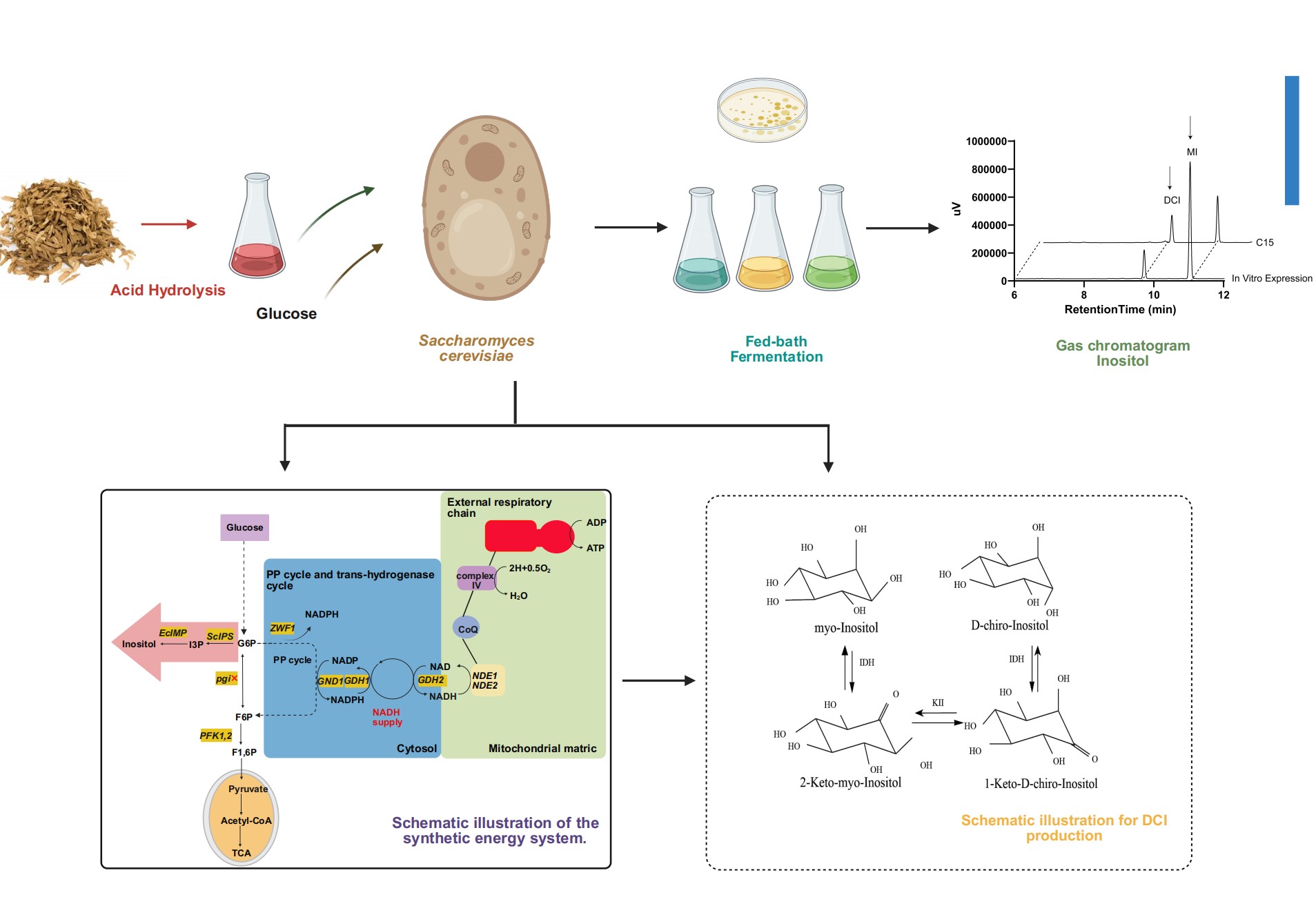 张梁教授团队通过工程改造酿酒酵母构建了从木质纤维素生物质从头合成DCI的微生物平台,首次实现了酵母中DCI的从头高效生物合成,为可持续生产肌醇衍生物及推动循环生物经济提供了可扩展的绿色工艺。为实现DCI在酿酒酵母中的高效合成,团队设计了一套分阶段代谢工程策略,主要包括四个模块:(A) 强化肌醇合成途径;(B) 重定向碳代谢流;(C) 优化转运系统;(D) 重构能量代谢体系。肌醇为DCI合成的关键前体,研究人员首先通过过表达酿酒酵母内源的肌醇-3-磷酸合酶(ScIPS)及大肠杆菌来源的肌醇单磷酸酶(EcIMP),构建了肌醇合成途径。结果表明,采用强启动子PTEF1的效果优于PGAP,所得菌株C03实现了肌醇的从头合成,产量达0.35 g/L,相比野生型实现了从无到有的突破。为解决碳代谢流向乙醇发酵竞争性分流的问题,研究采用“开源节流”策略,一方面敲除磷酸果糖激酶基因(pfk2)和6-磷酸葡萄糖脱氢酶基因(zwf1),减少竞争性碳耗用;另一方面引入来源于双歧杆菌的磷酸酮酶(Bbxfpk)和克雷伯氏菌的磷酸转乙酰酶(Ckpta),同时敲除pfk1,构建非氧化糖酵解途径(NOG)。该人工旁路有效减少了丙酮酸脱羧过程的碳损失,提高了碳原子的转化效率。改造后菌株C06肌醇产量提升至1.56 g/L,乙醇产量降至3.13 g/L,比生长速率提高50%。为防止胞外产物被重新摄取并促进分泌,研究人员进一步敲除了内源性肌醇转运蛋白基因ITR1和ITR2,同时过表达水通道蛋白Fps1和甘油促进因子GlpF。该策略使肌醇产量提升至2.32 g/L。为协调肌醇合成对NADPH的高需求与细胞生长对ATP需求之间的矛盾,研究构建了一个包含三模块的合成能量系统:敲除pgi基因,强制碳流进入磷酸戊糖途径以生成大量NADPH;利用GDH1/GDH2循环将多余NADPH转化为NADH;引入线粒体外膜NADH脱氢酶(NDE1、NDE2),将胞质NADH导入线粒体驱动氧化磷酸化生成ATP。在此基础上结合适应性实验室进化(ALE),最终获得菌株C13,摇瓶发酵肌醇产量达7.32 g/L,较初始菌株提升315%。胞内辅因子测定显示NADPH水平显著提高,有效支持了目标产物的合成。在获得肌醇高产菌株后,研究进一步引入异源肌醇2-脱氢酶(IDH)和异构酶(KII),构建DCI合成途径。通过对不同来源酶的系统筛选,确定T. maritima来源IDH与G. stearothermophilus来源KII的组合最优。最终菌株C15在摇瓶发酵条件下实现DCI产量1.42 g/L,为目前酿酒酵母异源合成DCI的最高报道水平。研究进一步尝试利用农业废弃物——烟草茎秆作为碳源。在以烟草茎秆水解液为唯一碳源的补料分批发酵中,工程菌株消耗了37.47 g/L的还原糖,最终产出 3.34 g/L 的肌醇和 0.50 g/L 的DCI。这证明了该平台利用廉价生物质原料进行高附加值生产的可行性。
