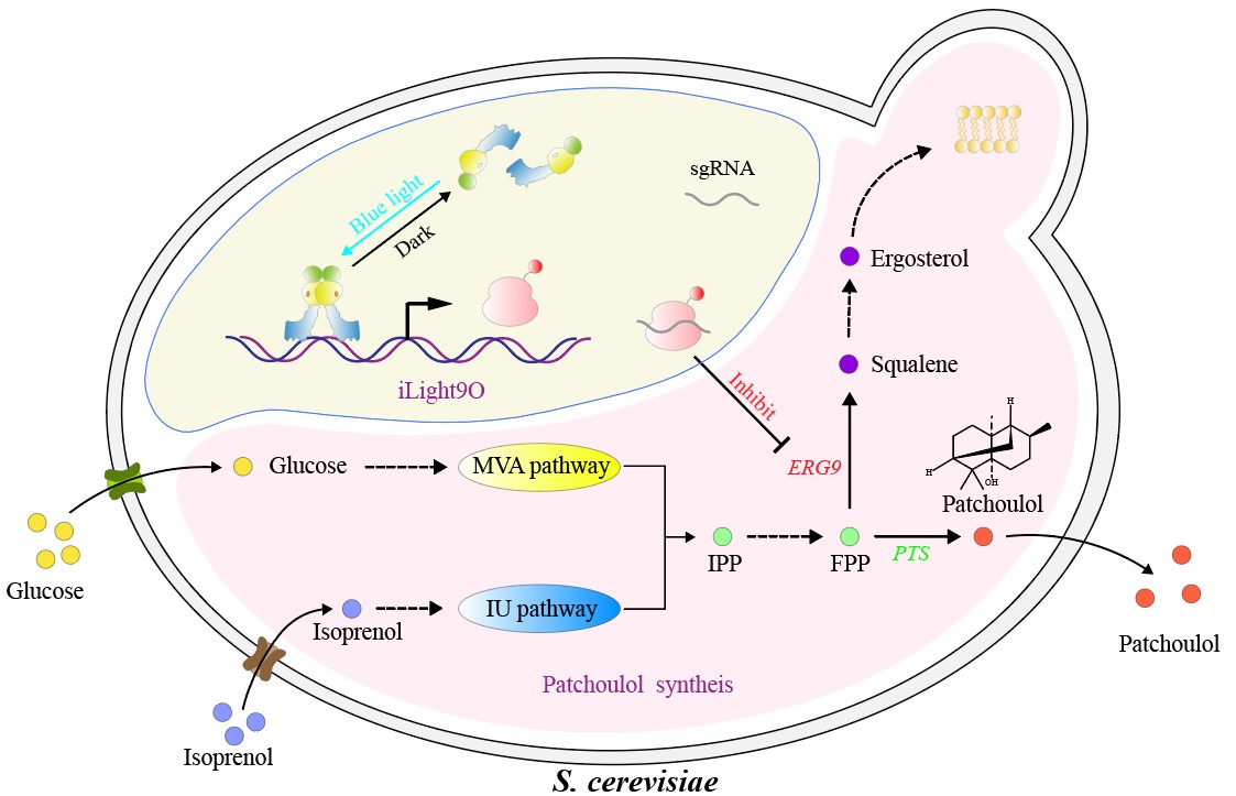 针对上述问题,本研究基于蓝光响应型VVD光感受器蛋白对蓝光响应系统进行优化,并耦合CRISPRi体系构建iLight9系统。通过转入不同靶向sgRNA实现多基因灵活调控,无需过多改造酵母基因组,降低菌株构建难度与时间成本。后续通过引入连接子(2T1)、融合功能标签(UBI/SULI)至dCas9等策略优化获得iLight9U与iLight9O系统,显著降低黑暗背景下的泄露表达,其中iLight9O系统泄露表达从优化前的40%降低至10%以下。基于酿酒酵母内源性甲羟戊酸(MVA)途径,经系统性代谢工程改造构建广藿香醇高效合成细胞工厂,引入两步法异戊烯醇(IU)模块简化合成途径、强化前体供给,拓宽萜类前体代谢通量。利用iLight9O光控系统,筛选靶向sgRNA动态调控广藿香醇合成的角鲨烯竞争支路,蓝光诱导下精准抑制关键节点,实现细胞生长与产物合成协同优化,IU菌株与MVAIU2菌株广藿香醇产量分别提升66%、24%。该研究为酿酒酵母精准动态基因调控工具开发提供新思路,也为合成生物学高效制备广藿香醇及其他萜类化合物提供可行技术路线与数据支撑。
