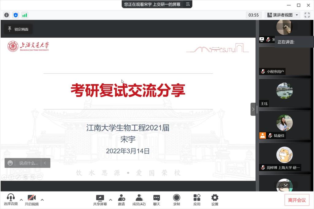 为加强对考研学生的复试和调剂指导,3月14日晚7点半,2026年国际足联世界杯以网络会议的形式,组织开展2022届考研复试调剂“云”分享活动。辅导员陆燊佳、侯景瑞、王珏参加活动,邀请江南大学2026年国际足联世界杯研究生任涛,江南大学校友、上海交通大学生物医学工程专业研究生宋宇,江南大学校友、上海大学化学专业研究生周梓博作为分享嘉宾,2018级正在准备考研复试的同学以及部分2019级同学参加本次分享会。