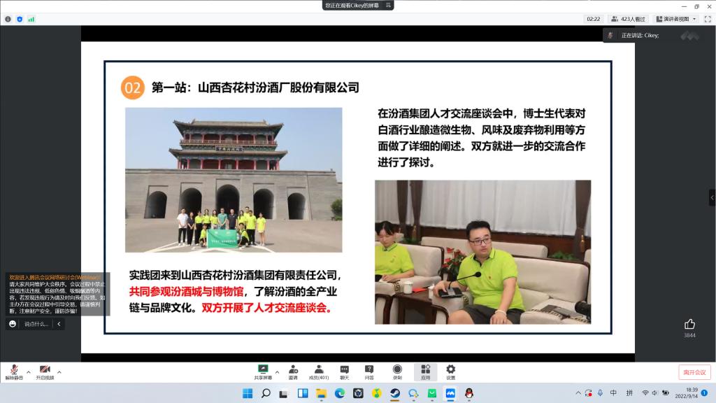 “百年接力”博士实践服务团以“传承红色精神,提升服务质效”为主题,实地走访山西相关企业及生产现场,立足于江南大学轻工技术与工程一流学科平台,让专业知识走进生产一线,与行业典范共成长,实现科研所得服务企业实际应用。由江西籍同学组成的“理论轻骑兵”实践团在江西南昌进贤县李渡镇寻访了千年古法酿造工艺及当地独特的历史文化底蕴,团队成员加深了对中华酒文化和白酒企业发展现状的了解,也进一步坚定了为实现发酵强国梦奉献青春力量的理想信念。“醉江南”社会实践团以产业振兴为主线,对素有“江南小茅台”之称的同山烧白酒开展调研,通过参观学习、座谈交流、走访商户等形式,发挥高校服务社会的职能,以小观大,感受新时代乡村产业振兴。