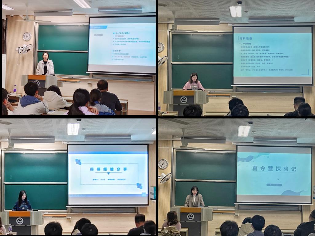 分享环节,分别被江南大学、华中科技大学、上海交通大学、中国科学技术大学、浙江大学拟录取的宋敏霞、罗舒元、朱小青、孙丹、李梦轩五名同学依次上台交流经验。她们根据亲身经历,从保研条件、时间节点、材料准备、联系导师和面试要求等多方面进行了详细介绍,并耐心细致地解答了同学们提出的疑惑,给予了很多中肯的建议。