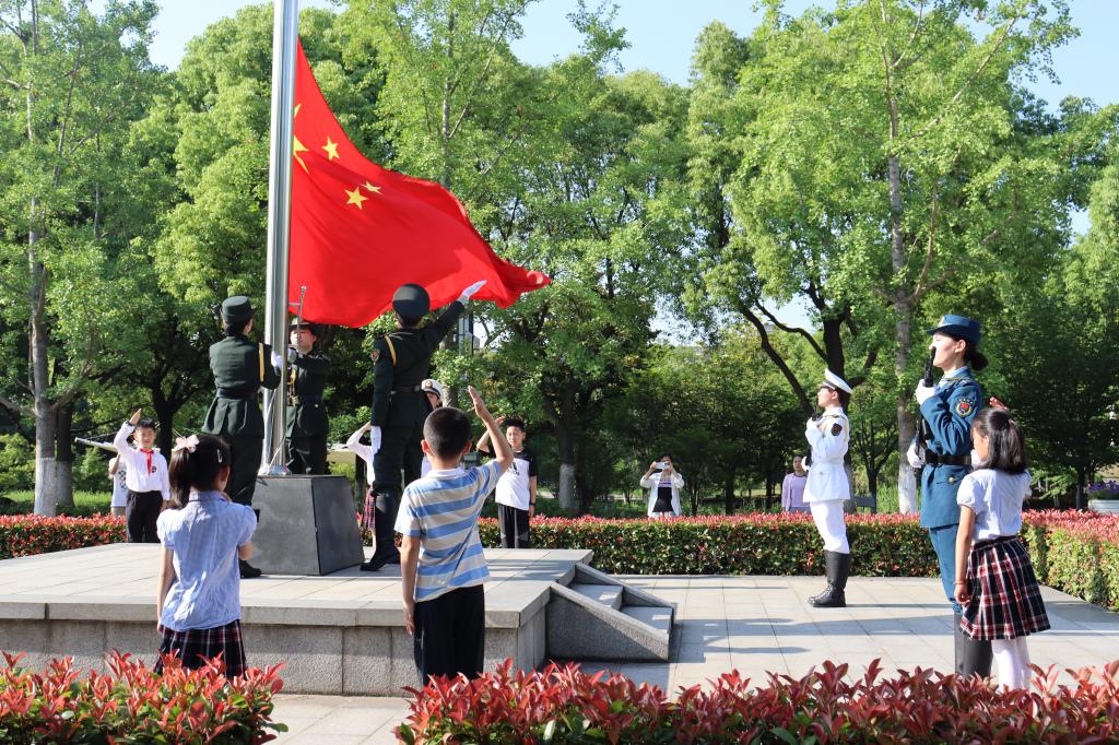 大手拉小手,国旗下成长。活动伊始,11名小朋友为家长敬献红领巾。随后,伴随着雄壮的《义勇军进行曲》,国旗班成员与小朋友们手拉手,共同迈着铿锵的步伐,完成了出旗、升旗等环节任务,鲜艳的五星红旗迎风飘扬,心中的爱国之情激荡澎湃。