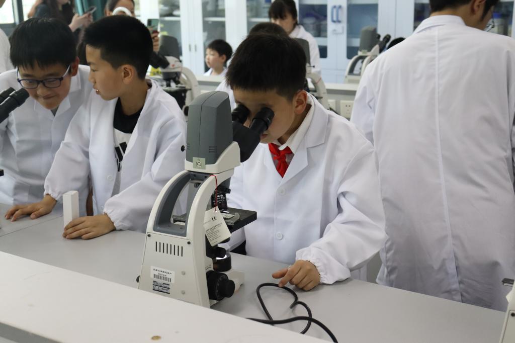我是小小科学实验员。到了科学实验体验环节,每张小脸都写满了期待和兴奋之情。第一个实验是用显微镜揭开微生物的神秘面纱,操作时孩子们轻轻推动载玻片,小心翼翼地旋转着准焦螺旋,通过显微镜,孩子们惊奇地发现了新大陆,一个个不禁为这五彩斑斓的微观世界拍手叫好。